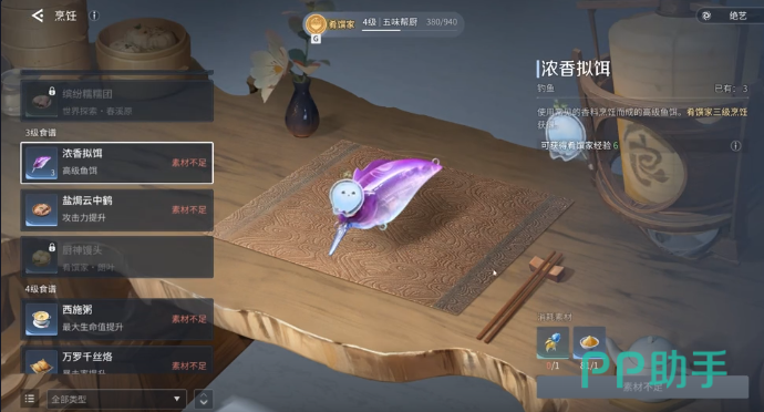 第二个关键条件那就是正确的使用鱼饵,只有合适的鱼竿是不足够的,鱼饵的选择就会直接决定垂钓的成功几率。钓褐斑龙鱼必须使用浓香拟饵,这一个鱼饵就是高级的诱鱼神器,可以大幅度的吸引稀有鱼上钩。而这一个鱼饵的制作地点就是烹饪台。玩家就需要准备香料鱼粉,还有鱼果木两种材料。不少的玩家可能会忽略鱼饵的重要性,只是使用普通的鱼饵,难怪怎么样都没有办法成功的垂钓。