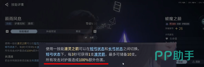渡灵之箭是伽罗的核心输出技能,释放后进入长弓状态,每一次在射击之前都会消耗在连续射击之后,射击的速度还会进一步的提升。在暴击之后还会额外的射出箭,然后补充伤害,是远程持续输出的主要手段。静默之箭冷却时间20秒,射出箭矢之后,就可以造成成吨的伤害,还可以及时的击退敌人,击飞敌人。在释放之后还能够将下一次的普攻强化成瞬间连射,在实战的过程中就会拥有全面的作用。