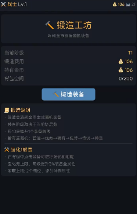 为了让大家快速提升自身的战斗实力,因此就需要在四大不同职业中挑选,比如有游侠或者是战士,其次还需要率先建立自己的锻造工坊,可以在工坊当中随机锻造不同的装备类型,全面提升自身的战斗实力,但是在使用的时候都会消耗一定的金币,从而才能升级随机的装备类型。在每次获得的装备等级中,也是和自己的爬塔层数有很大的关系,比如10层就会提升一个装备的等级,稀有度也会随机生成,包括从普通再到神话等等。