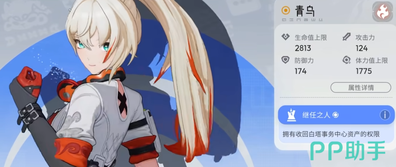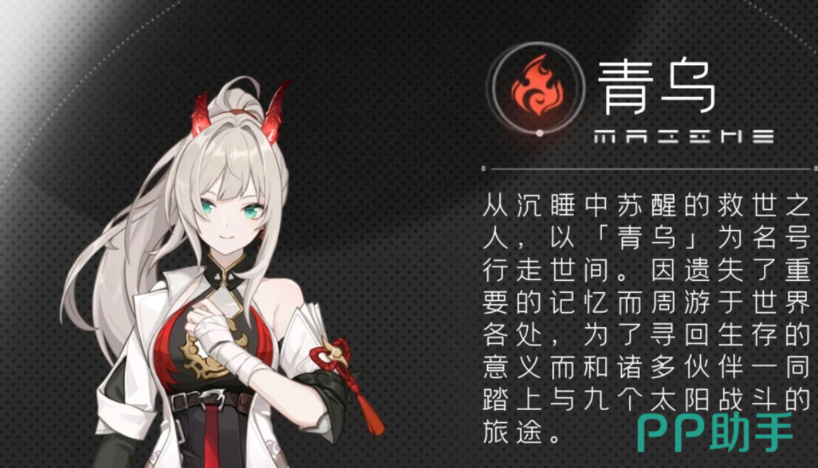 青乌是月能管理局外勤队的一员,是位爆发力很强的火属性输出。她最典型的技能是闪射回旋,它具有很强的机动性,并且可以给敌人造成持续的灼烧伤害。青鸟的战斗核心是“光域”,当层数达到三层的时候就会触发终结技“天光如灼”,瞬间释放出大面积的高倍率火属性伤害,还会附带禁疗效果来克制回复型敌人。技能树加点上要以光域层数快速叠加、灼烧伤害倍率最大为原则,发挥出她的爆发窗口期的输出优势,使她成为战场上收割敌人的利刃。