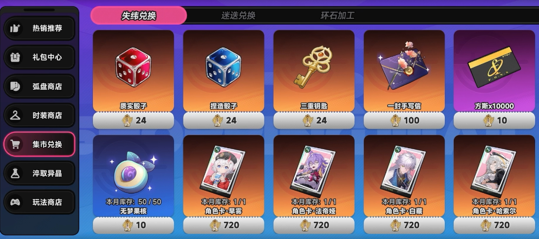 主要获取方式之一为棋盘探索系统:玩家通过在专属抽卡棋盘上移动步数,抵达不同格子后可领取对应奖励,其中包含大量“棋盘兑换券”。该兑换券可在【骰子兑换商店】中不限量兑换捏造骰子,兑换比例固定且长期开放,是稳定积累骰子的核心途径。