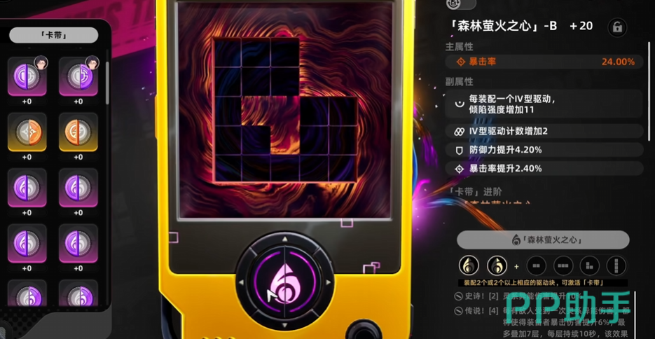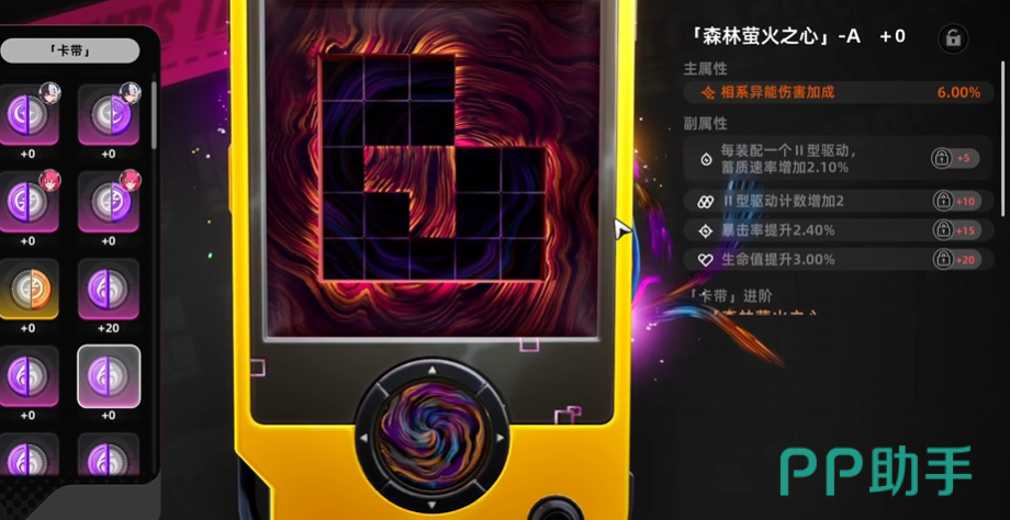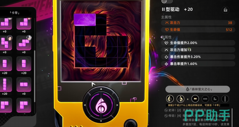 卡带装配完成后,界面右下角将显示由方格组成的嵌入面板。除左右卡带外,还需在右侧四个固定位置安装“驱动块”——即上半区域的核心组件。驱动块的类型、属性及排列顺序,必须严格满足当前卡带所要求的套装规则,否则无法触发加成。