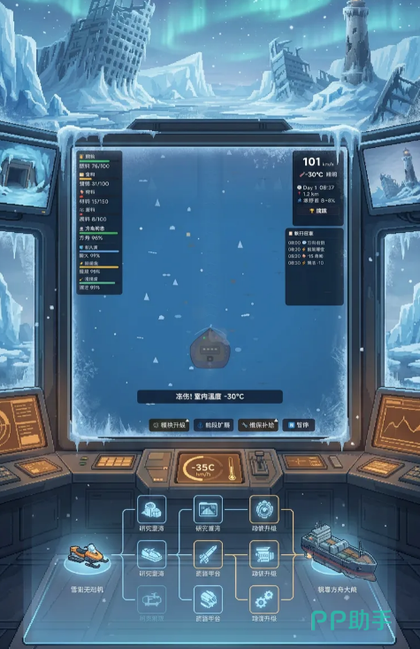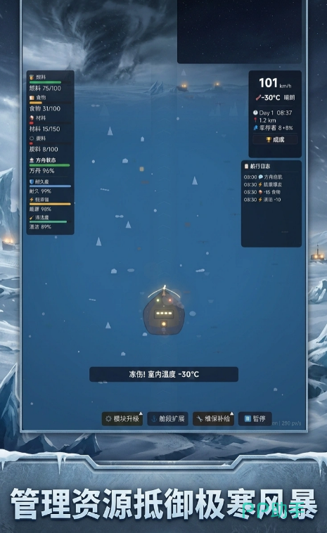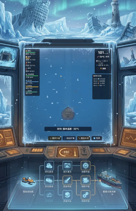 游戏设定于全球冰封的灾变纪元——地表温度骤降至-60℃以下,旧有城市尽被永冻层掩埋,幸存者仅能依托移动方舟维系文明火种。玩家将担任“方舟指挥官”,统筹能源调度、舱体维护、人员编组与低温适应性改造。每处废墟探索、每次救援行动、每项技术升级,均直接影响方舟的续航能力、抗寒等级与生存半径。飞船并非静态载具,而是随玩家决策持续演化的生命体,通过收集稀有蓝图与极地矿物,可解锁热核供能、冰层破障、生态穹顶等关键模块。