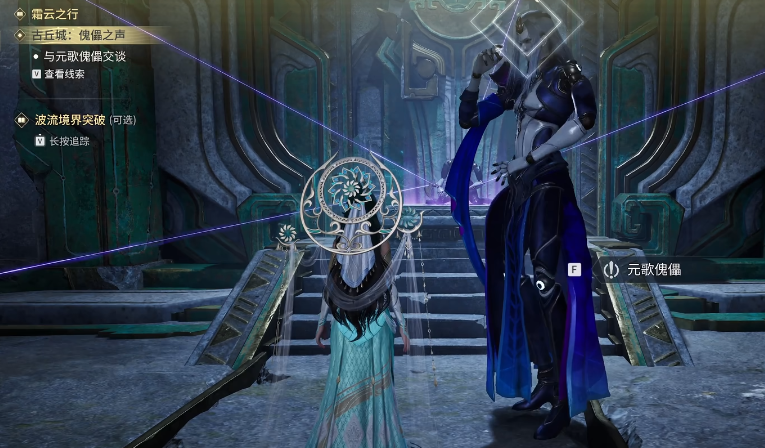 循着元歌傀儡散发的光源前进,可抵达第三处关键点位。此处需借助飞鸟NPC提示攀至二层平台,先完成一场限定战斗(击败守关怪物),飞鸟将立即更新导航信号。新区域中再次出现待修复傀儡,交互后可抽取第二段“记忆丝线”。元歌傀儡持续现身引路,最终引导玩家潜水潜入神殿深层区域。此处空间布设大量穿透性机关射线,操控对应装置一次即可解除全部束缚,至此“鲲游·古丘城”全流程挑战正式达成。