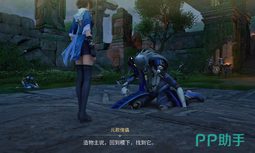 继续前行将抵达一扇紧闭的石门,需操作左侧机关开启。门后可拾取“傀儡核心”,随后返回起点,为指定傀儡装配核心。装配完成后,傀儡将进行一段专属演出,结束后元歌傀儡再度现身,引导前往下一区域。击破新区域入口大门后,进入布满巨型古树的空间,树干及枝杈上悬垂着多组被蛛丝缠绕的傀儡躯干部件。玩家需依序拾取并安装至对应傀儡本体,成功拼合后将解锁“记忆丝线”,元歌傀儡随即再次出现,开启下一段指引流程。