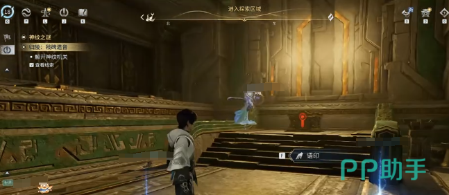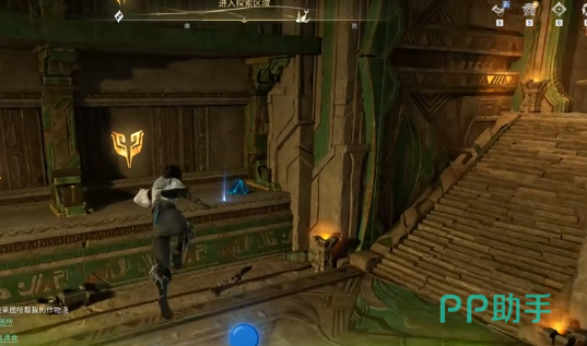 完成首层放置后立即返回初始机关点,启用钩锁功能,仰视上方角落寻找锚点,借此攀至第二层平台。视野开阔后,可见待安置的第二块石块。需将其牵引至左侧第三块石板,该石板刻有竖形神纹图案,必须确保石块完全覆盖神纹轮廓并稳定落定,方可触发第二处墙面亮起反馈。