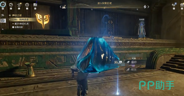 解谜起始阶段需进入机关区域,锁定已激活发光的台阶——其上静置一块可交互蓝色石块。靠近即可触发牵引判定,将其平稳拖离原位。随后转向对侧区域,定位左侧第二块石板,将蓝色石块准确置于其表面。此时墙面相应位置将同步亮起提示光效,标志第一阶段完成。