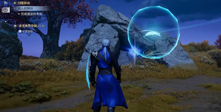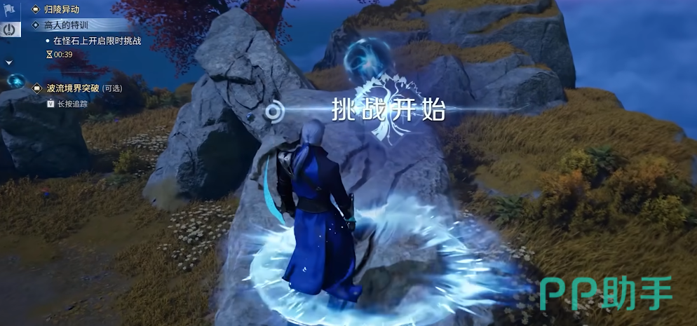 此阶段要求玩家在60秒内,沿指定路径跳跃至各悬浮光圈位置并完成交互。光圈呈环形分布于多块岩石顶端,需合理预判落点与起跳时机。超时未集齐则挑战失败,需重新与李元芬对话再次开启。全部光圈收集完成后,返回与其最终对话,即可确认任务全流程完结。