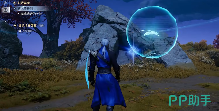 该任务触发条件为角色波流等级达到2级。满足等级后,传送至映暮石滩传送点,向东南方向直线行进约180米,在乱石堆区域采集【燃烧果】,随后与附近出现的【武道学生】NPC对话,即可正式接取“高人特训”任务。