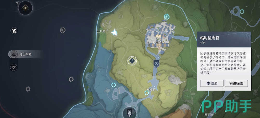 任务起始后,自动开启追踪路径,目标地点为霜云镇·云舟栈。抵达传送点后,请沿栈区东侧小径持续前行,直至视野中出现独立院落式建筑。进入该建筑后,与NPC奕晟对话,即可正式接取【监考余波】见闻任务。