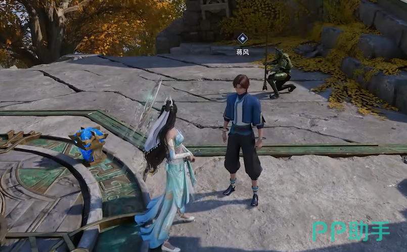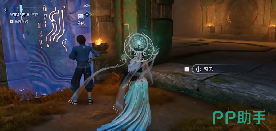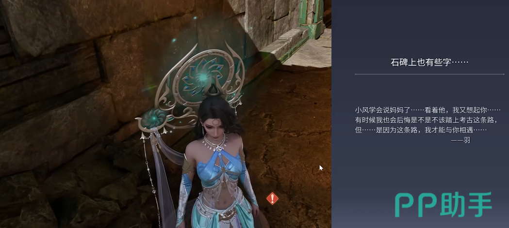 完成对话后沿小径深入,对地面碎石堆进行调查;返回蒋风处汇报后,跟随其进入遗址内部,定位中央青铜石碑并开展调查。若此前未完成前置条件,可采用替代方案:踩下遗址中央压力板,触发燃烧果弹射机制,使其命中四周四座石碑,从而激活青铜石碑碎片解锁;拾取该碎片并安放回原位后,即可正常读取碑文内容。