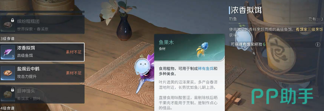 饵料选择同样关键。实测数据显示,使用浓香拟饵可显著提升褐斑龙鱼的捕获率,是当前版本中最高效的选择。该拟饵需在游戏内烹饪台合成,所需原料为鱼果木与香料鱼粉。合理搭配装备与饵料,是优化操作逻辑、提升目标鱼种命中效率的核心策略。
