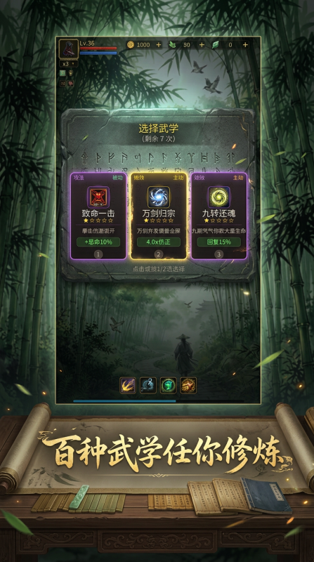 游戏中最有意思的地方就是随机的武学搭配,在战斗的过程当中,大家能够捡到万剑归宗,九转还魂。等等技能,通常是将主动技能,被动技能等等技能随便的组合在一起,这时候想要玩爆发流就直接堆暴击跟伤害,想要玩续航的话,就需要带回血跟防御,所以说在搭配具体流派的时候通常是没有固定的套路。玩家是怎么爽快怎么来,但是每次闯关的时候所涉及到的技能都是不一样的。