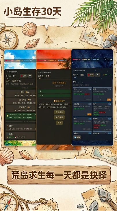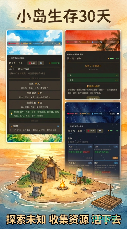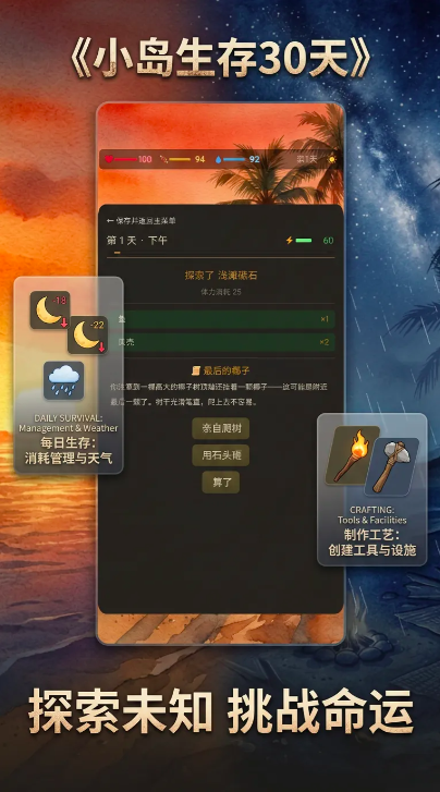 飞机失事后,你成为了唯一的幸存者,但却意外流落到了这片荒岛,而在救援队赶来前的30天,要如何才能成功生存下去?每天都会面临不一样的抉择。