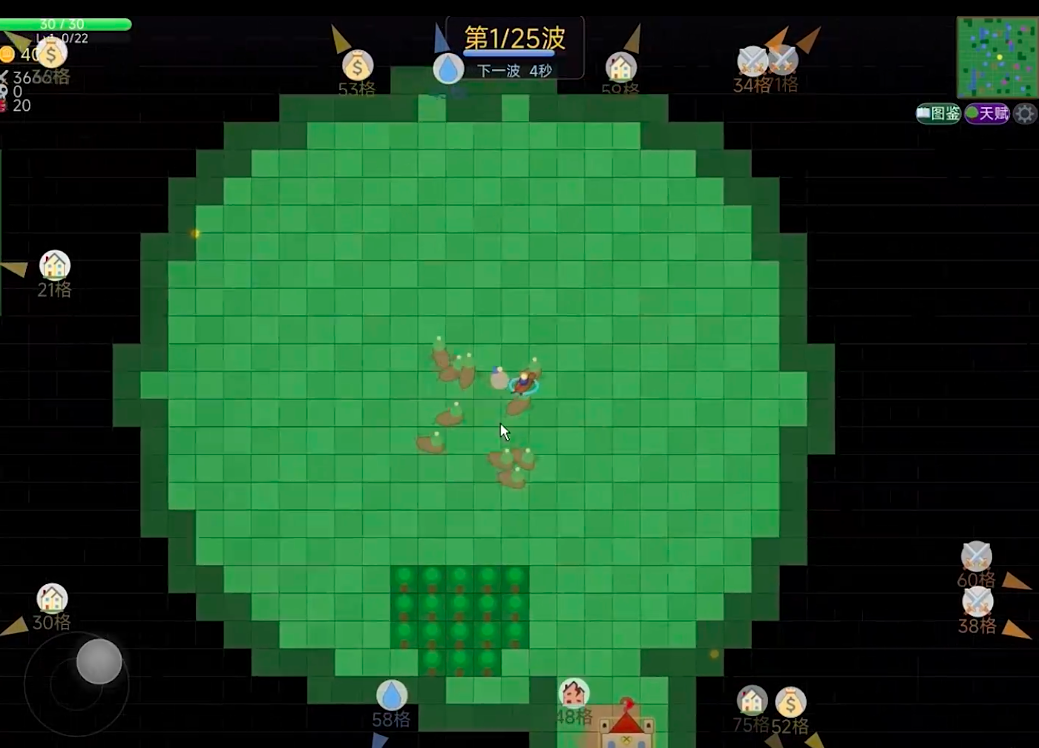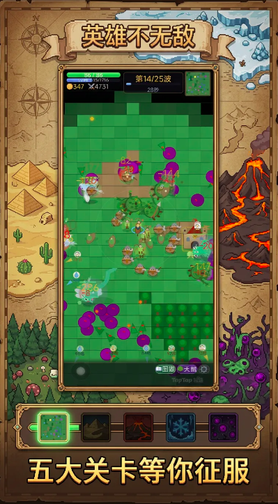 作为平面肉鸽游戏,它的整体玩法原型还是非常不错的,可以看出开发方在其中下了一定的功夫。而主角其实游戏当中的英雄,怪物在进入射程后就会自动开启攻击模式,基本的肉鸽经验体系是存在的,升级后肉鸽卡牌还可以进行三选一,主要是通过多次来进行游戏的,每一波开始之前可以完成兵种招募,招募来的兵种则可跟随玩家开启自动战斗模式,所有的兵种设定都可以通英雄,开启无敌模式,这种玩法大大提高了整体的通关概率,也让游戏的可玩性快速飙升。