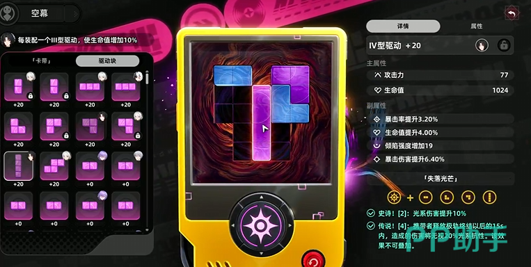 空幕为角色装备体系,采用“1卡带+4驱动块”结构化设计。卡带决定套装属性(含2件套与4件套效果),每张卡带固定携带1条主属性与4条随机副属性;驱动块分II、III、IV三种型号,外形各异,需按卡带指定形状嵌入类俄罗斯方块式布局格中,方能触发套装加成。驱动块主属性恒为生命值或攻击力,副属性随机生成。卡带与驱动块强化上限均为20级,每提升5级解锁1条强化词条(共4条)。