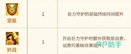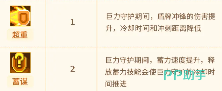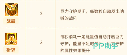 第四项【蓄谋】——加快技能蓄力速度;成功释放蓄力技后,将立即推进“巨力守护”的剩余冷却时间; 第五项【战鼓】——技能持续期间,每隔固定秒数自动触发一次范围战吼效果; 第六项【祈求】——进入自动施放模式:每秒稳定消耗能量值,当能量充足时自动激活“巨力守护”,能量不足则自动关闭。