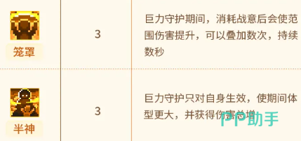 第七项【笼罩】——技能开启状态下,可通过主动消耗战意层数来提升范围输出能力,该效果支持多层叠加; 第八项【半神】——将“巨力守护”效果限定为仅作用于自身,同时大幅提升角色体型,并额外获得全局伤害总增益。