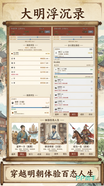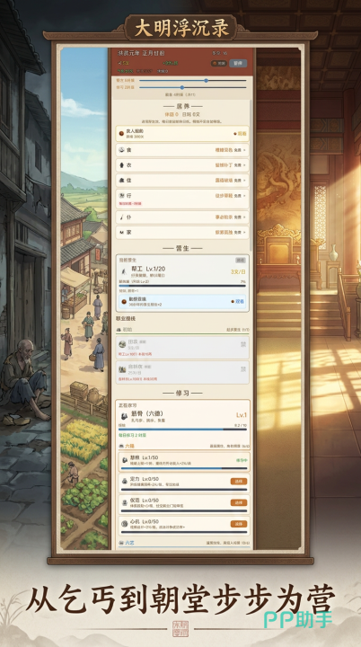 《大明浮沉录》是一款融合历史沉浸感与现代游戏节奏的明朝题材模拟经营手游。其核心机制巧妙平衡了低门槛的放置体验与高自由度的策略养成,让玩家既能轻松挂机积累资源,又能在职业发展、人际关系、朝堂博弈等维度展开深度规划。在指尖操作之间,既可体味市井烟火的日常温情,也能直面权力更迭的惊心动魄。