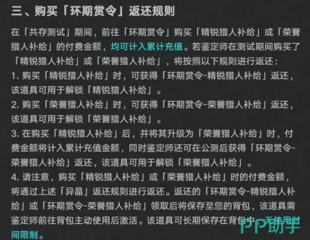 战令类道具(如精锐猎人补给、荣耀猎人补给)同样纳入返还范围。其购买费用计入总充值,公测开启后将以1:1比例返还对应战令道具。返还道具将存入背包,长期有效,但需玩家手动激活。激活后,战令等级与测试期保持一致,上线当日即可直接解锁高阶奖励,显著优化新版本初期体验节奏。
