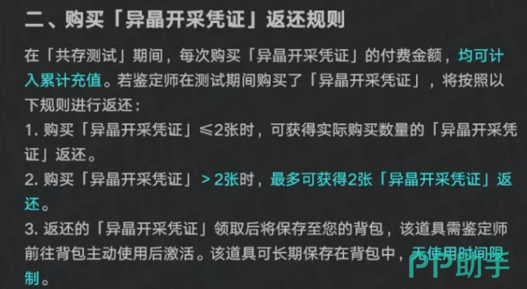 “异晶开采凭证”即玩家所称的异环通行证。该凭证在返还时采取“现金充值+对应道具”同步结算的方式。所有测试期间购买通行证所支付的金额,均计入玩家累计充值总额,并依据异晶返还标准统一换算。关于道具返还:每位账号最多可获得2张通行证返还;若购买数量为1张,则返还1张;购买3张及以上,仍仅返还1张。返还所得通行证将直接发放至角色背包,无存放时限限制,但激活后有效期为30天,激活后即可完整解锁全部权益。