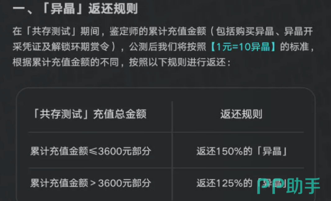 异晶返还为本次政策的核心环节。游戏内设定1元人民币=10异晶,返还按阶梯比例执行:累计充值金额≤3600元部分,返还比例为150%;超出3600元的部分,返还比例为125%。无论充值规模大小,玩家均可获得高于原始投入的异晶返还,切实提升测试资源转化效率。
