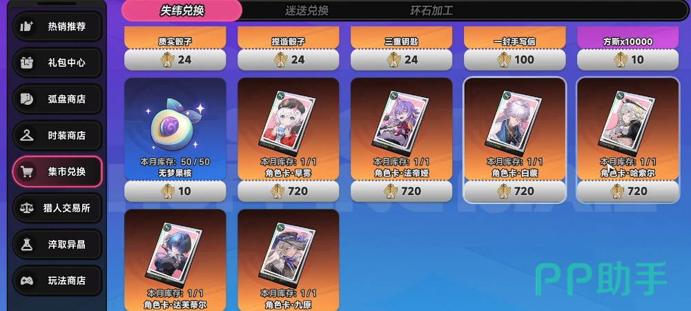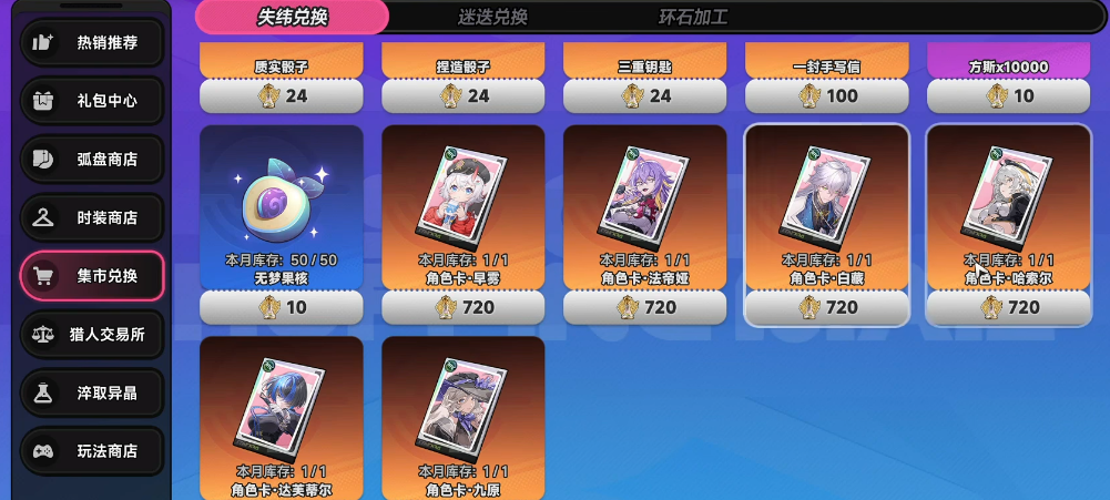 该兑换商店是核心枢纽之一,支持多种高价值道具兑换,其中骰子为主要产出项。由于每次抽卡均需消耗骰子,而骰子数量直接受限于当前持有的棋子总量,因此棋子储备量直接决定玩家单局内可执行的抽卡次数上限。该设计强化了资源规划意识,避免无脑刷取。
