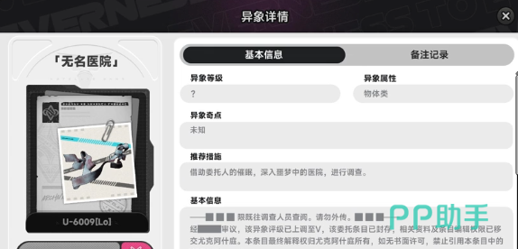 首先来到海特洛市立医院,进入医院之后,沿着右侧的走廊一直往前走,然后找到面向角落的问号角色。对话之后就可以进入到无名医院,然后来到右前方的咨询台获取患者线索,这是一个重要的道具。拿到线索之后朝着指引的方向前进,会遇到绷带怪人进入一扇门。要跟着进入到门中,可以找到监察记录线索仪,我在速通流程中,这一个道具用不上,可以直接跳过。继续开门,穿过下一个房间,然后来到红光指引的房间。