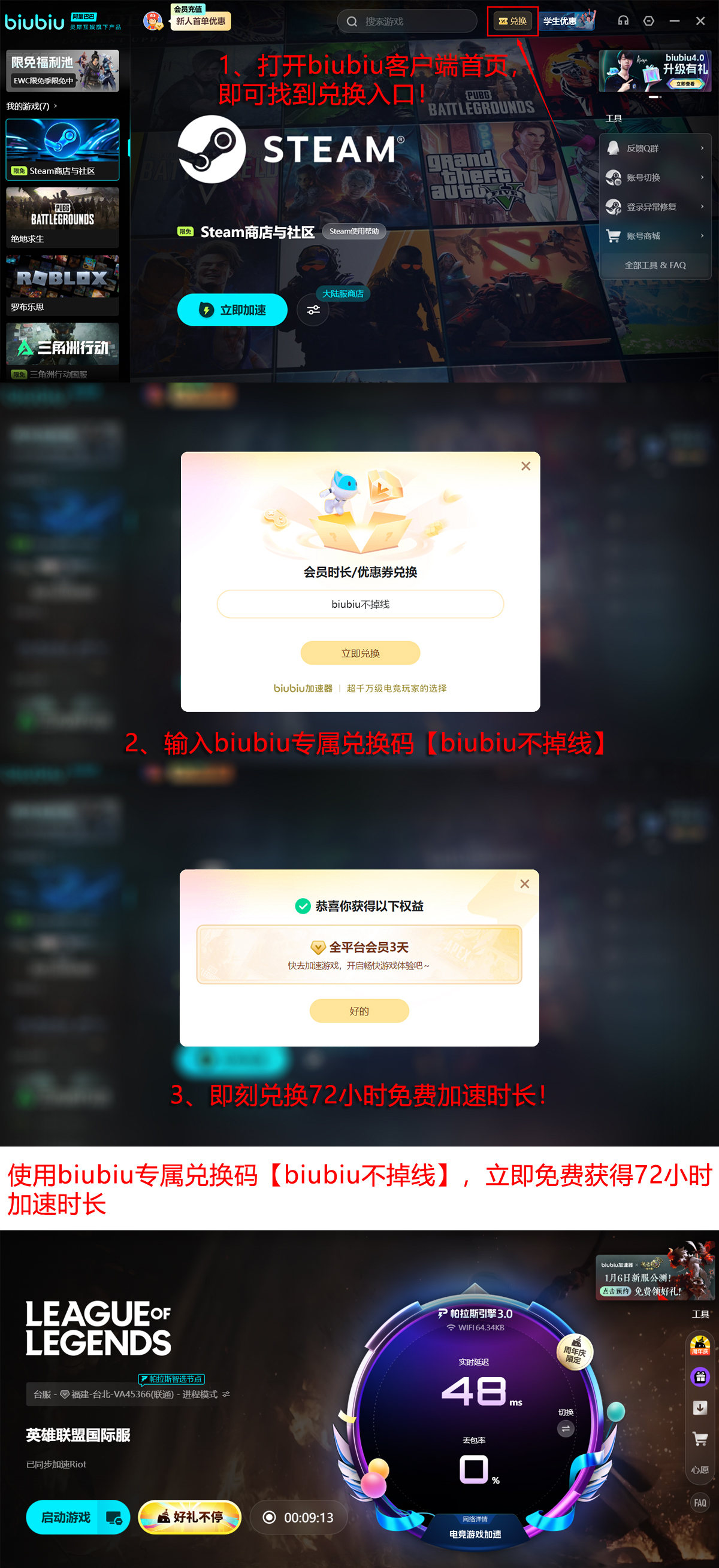 新用户注册后可立即获得24小时全功能加速权限;输入专属兑换码【biubiu不掉线】,还可额外叠加72小时服务时长,累计享96小时无限制加速体验,助力玩家无缝接入星辰战场。