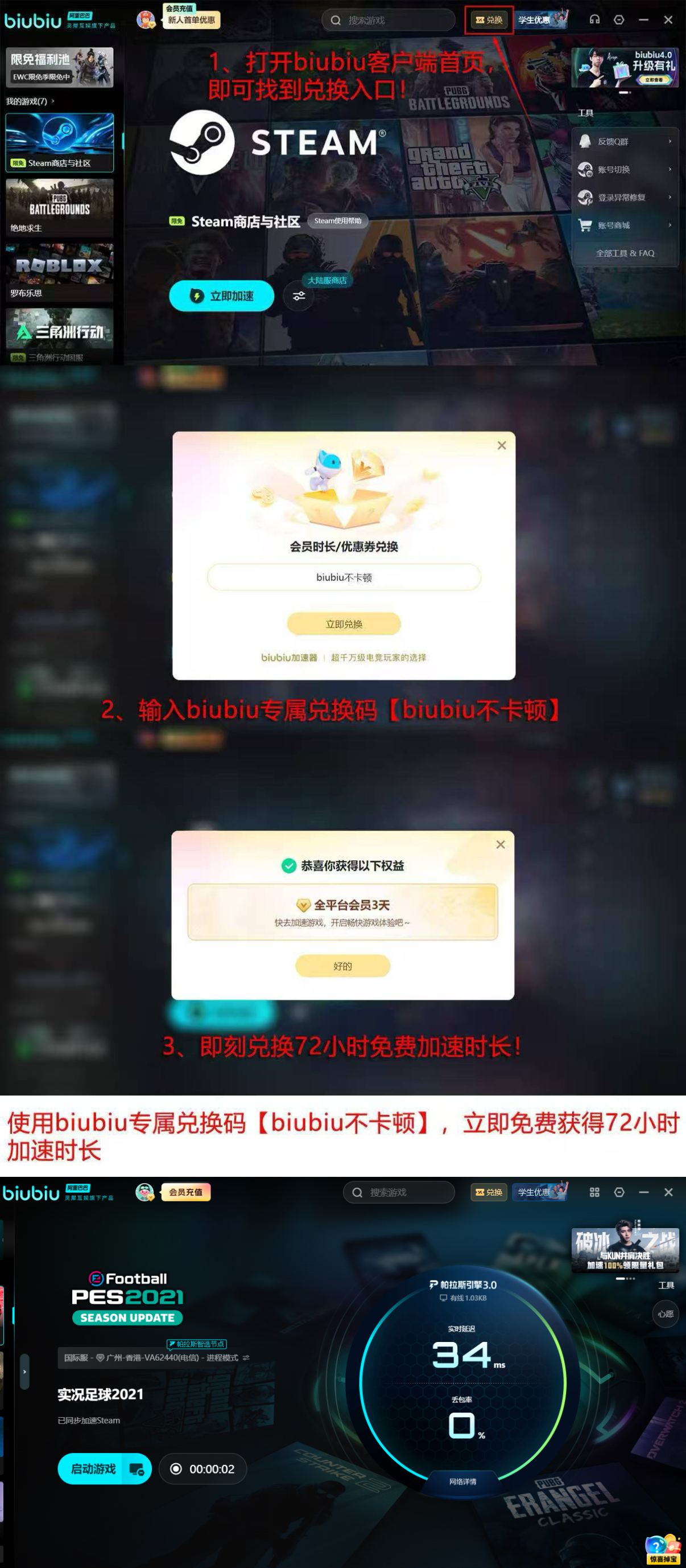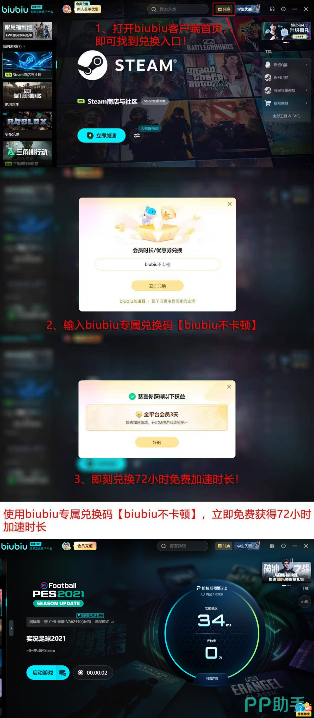 该工具采用自研帕拉斯3.0引擎架构,具备动态带宽分配、智能节点调度及低层网络协议加固能力,可从系统底层改善游戏运行环境。代言人小叮当作为PUBG职业选手,长期选用该加速器进行高强度训练与赛事备战,印证其在实时对抗类游戏中的可靠性。新用户注册后可立即获得24小时全功能试用权限;输入专属兑换码【biubiu不卡顿】还可额外激活72小时加速时长,累计达96小时,足够覆盖完整的新手适应周期与多场关键对战。
