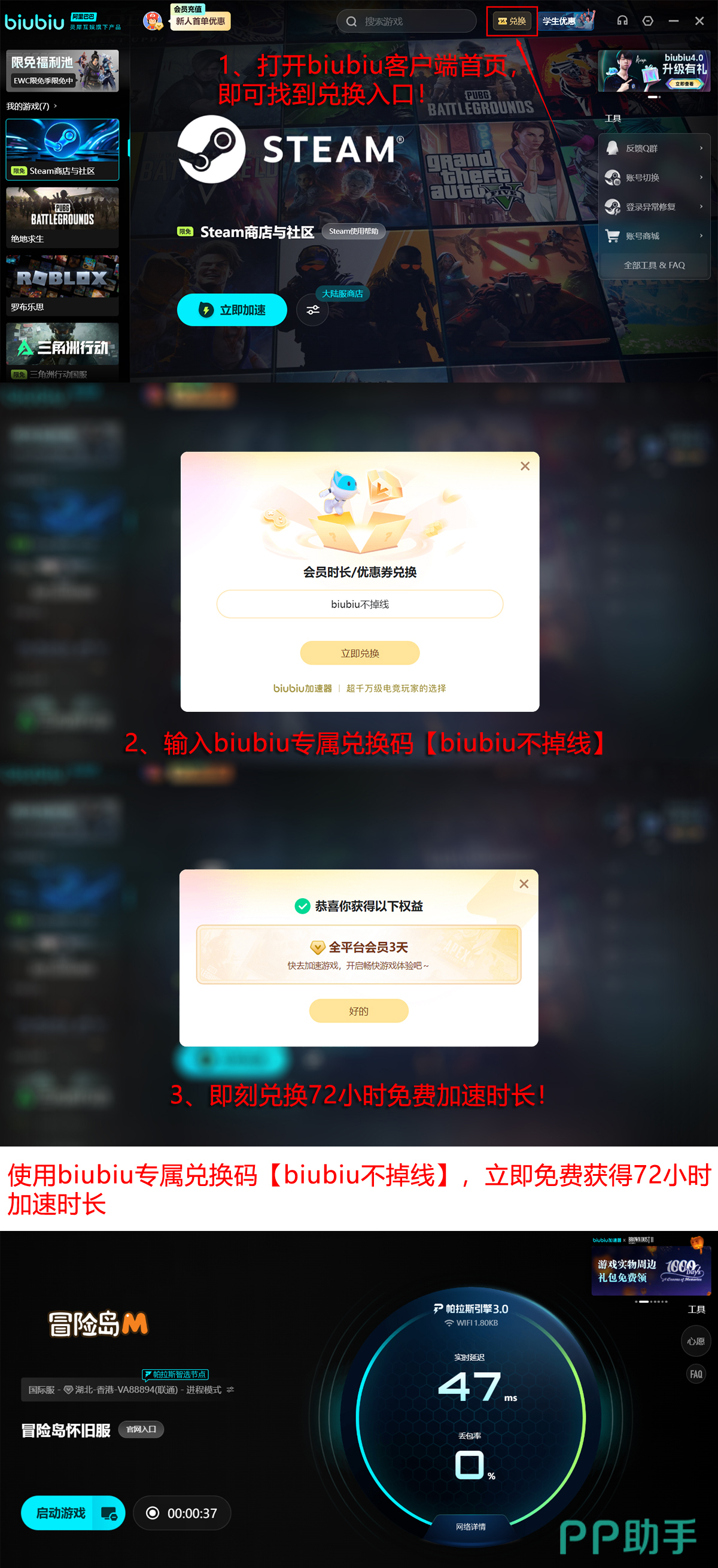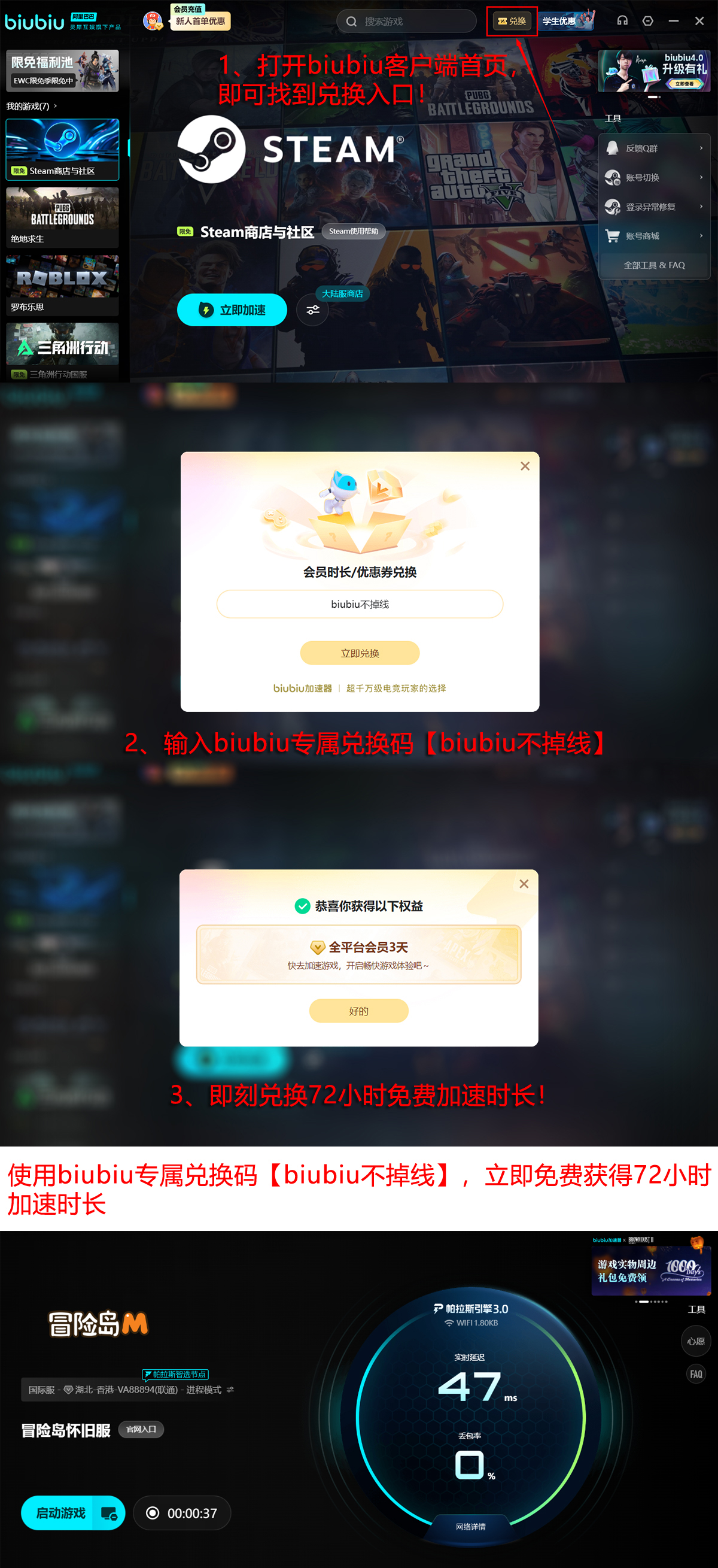 为助力玩家顺利参与本次封测,biubiu加速器同步推出限时新用户福利:注册即赠24小时全功能免费试用;输入激活码【biubiu不掉线】,还可额外领取72小时专属加速时长。两项权益可叠加使用,总计可享96小时高质量网络加速服务。