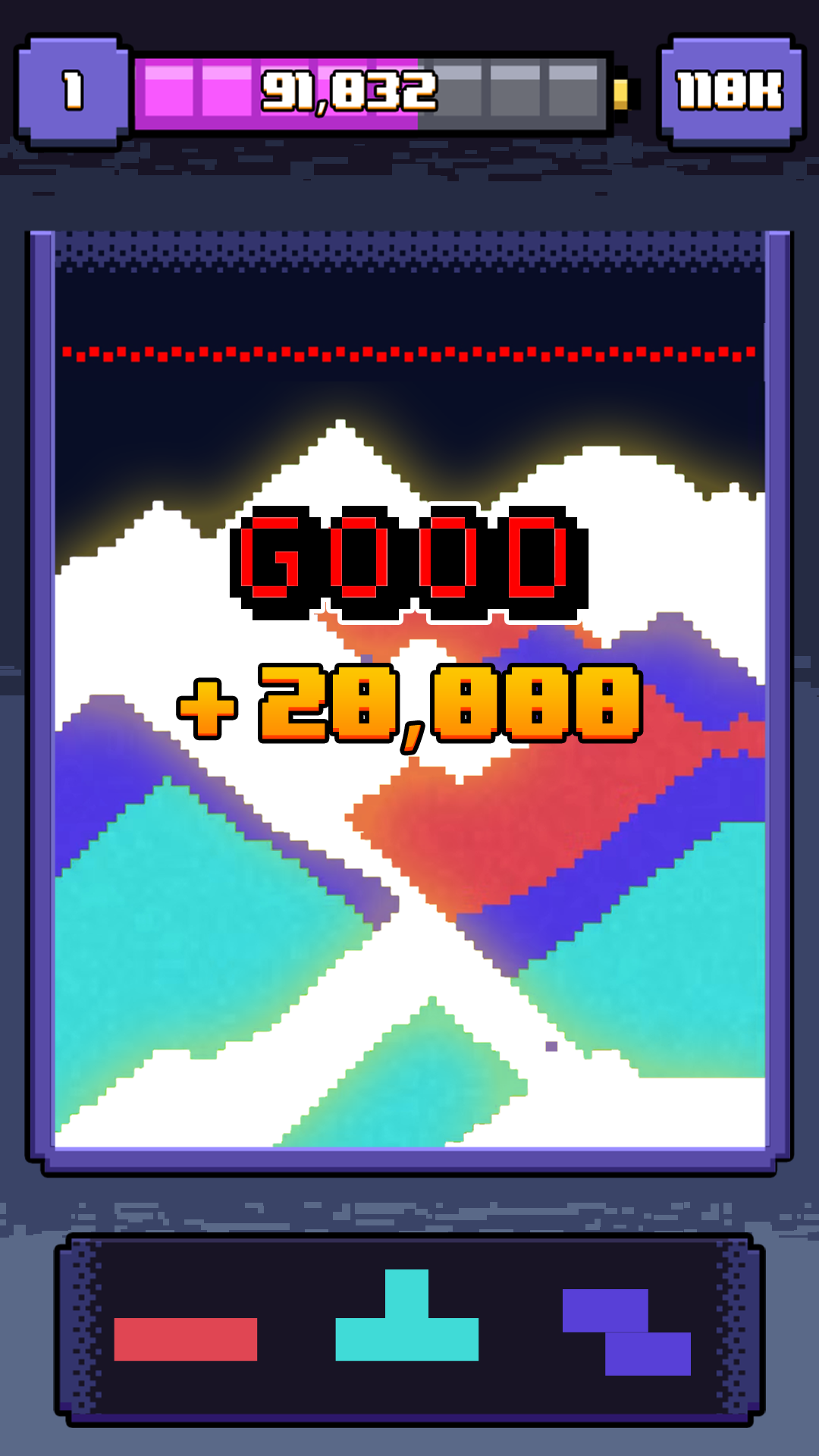 面向硬核玩家设计的进阶版本,基础下落速度初始即达普通版Level 15水准,并随得分持续加速。引入四线预判系统(Preview Line),支持同时观察当前块与后续三块;叠加连锁消除判定逻辑,连续清除多行可触发倍率加成。空间决策维度扩展:需同步评估当前落点、后续块适配性及底部结构稳定性。音效精简至仅保留消除提示音与失败提示音,杜绝听觉干扰,强化操作专注度。失败判定严格,顶部堆积触顶即终止,无容错重试机制。