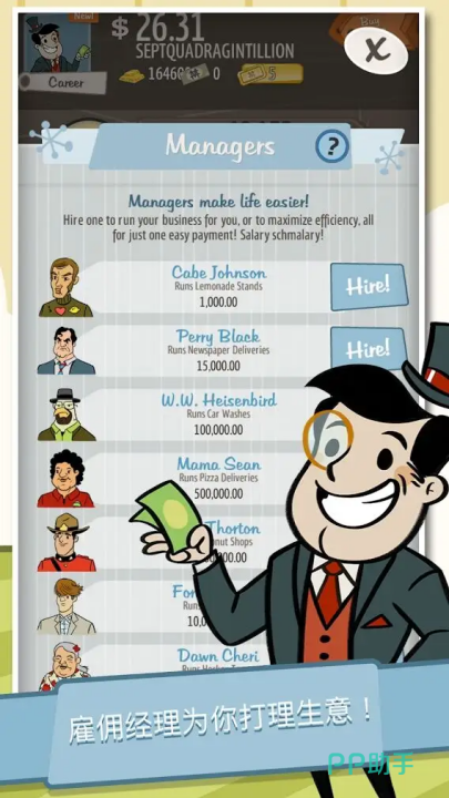 目标直指全球财富巅峰,游戏围绕资本权力演进路径设计核心玩法:引入具备国籍属性与技能专长的助手系统,每位角色对应差异化商业增益;每个产业模板(如能源、物流、金融)均配备独立场景规则与动态事件链,包含反垄断审查、供应链中断、汇率波动等现实商业危机模块,强调长期战略规划与突发响应能力的双重训练。