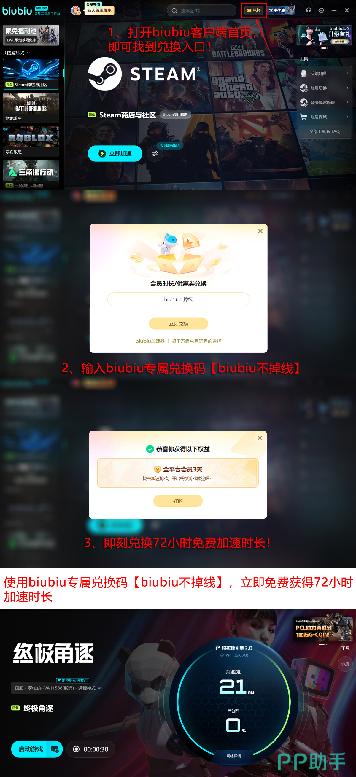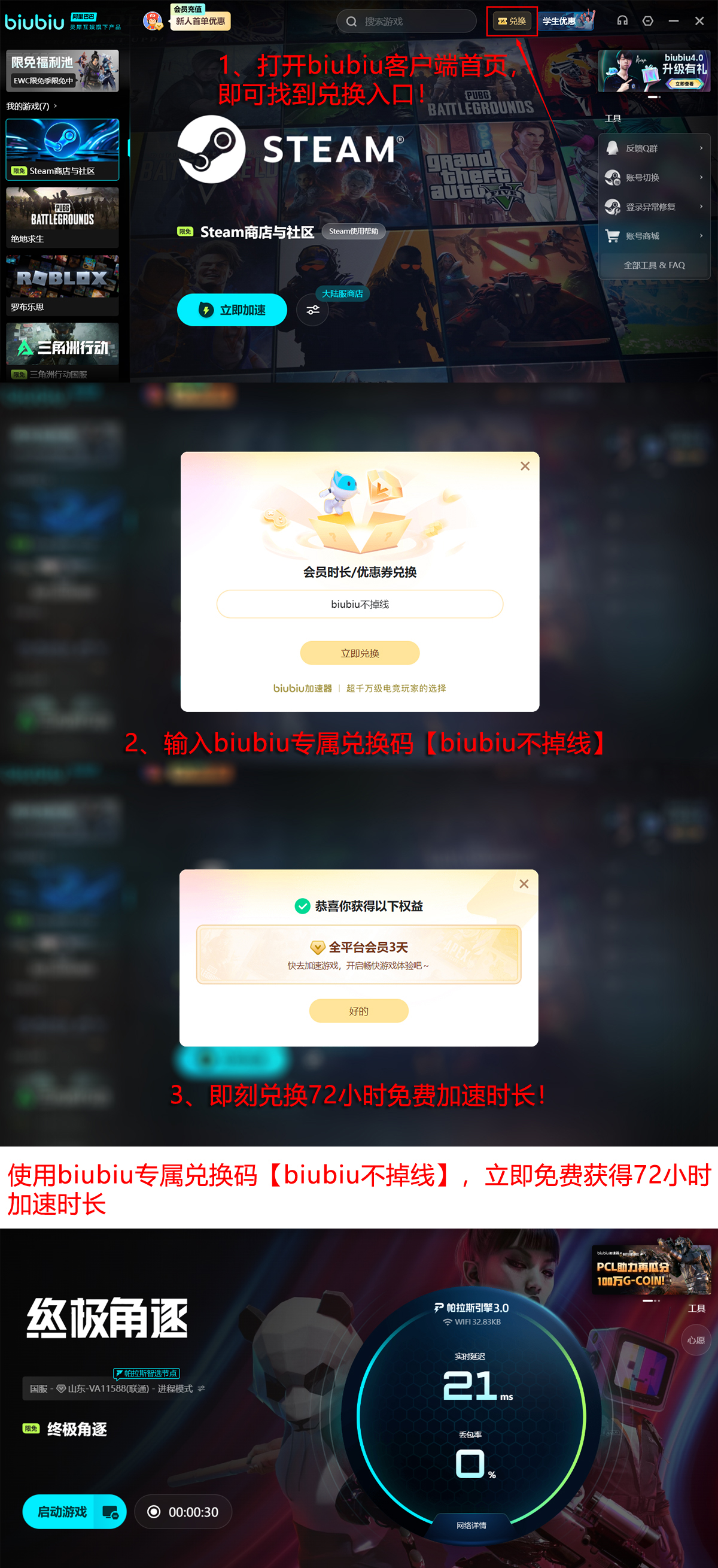 新用户注册后可即刻启用24小时全功能免费试用权限。活动期间输入激活码【biubiu不掉线】,还可额外领取72小时顶级加速服务。两项权益叠加,首登玩家最高可享96小时无限制优质网络支持,全程零门槛接入S2赛季核心战场。