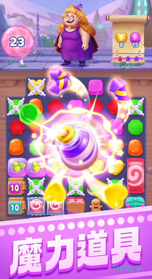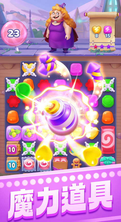 融合RPG元素的三消类单机作品。角色形象Q萌,场景建模细腻,动画流畅。包含“勇者远征”与“古宅探秘”双主线,每关设有独立通关条件与星级评价体系。消除机制引入特殊道具(如彩虹糖、条纹糖)与连锁反应设定,鼓励玩家主动调整糖果位置、构建大范围消除组合,而非依赖固定区域重复操作。支持离线成绩保存与本地排行榜比拼。