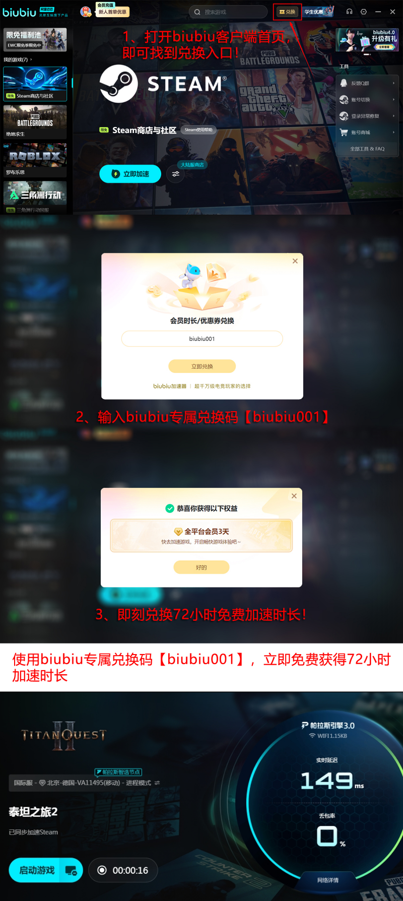 为助力玩家顺畅体验《泰坦之旅2》中的诸神之战与泰坦征伐,官方合作加速平台同步开放多重新人激励政策。新注册用户首次登录即可自动获赠24小时免费加速权益;另设通用激活码【biubiu001】,所有用户均可无门槛兑换3天加速服务。两项福利叠加后,总计可享96小时连续加速时长,无需任何充值操作。