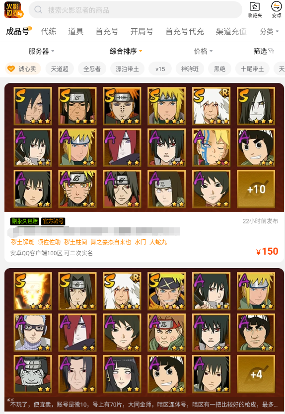 此外,《火影忍者》专区商品类型丰富,涵盖高练度成品号、资源充足的开局小号、稀有忍者碎片、定制代充及道具礼包等。平台内置智能筛选工具,支持按指定忍者(如六尾鸣人、波风水门)精准检索,并可依价格区间排序浏览。对于预算有限或偏好性价比的玩家,常有机会发现急售的大神号,实现高效捡漏。