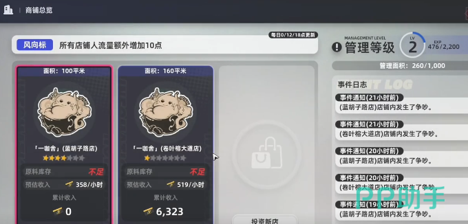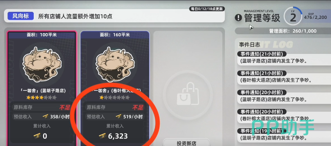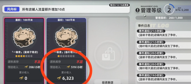 每一个雇员都会有专属的管理,还有经营技能等级在提升之后就可以显著的提升店铺的收益,还有降低运营的成本。商品上架以及库存管理就是维持店铺营业的关键,5级商铺最多可以上架三种商品。商品的类型可以自由的更换,能够满足不一样的经营需求。所有上架商品都可以支持升级,在升级之后就可以带来更高的收益。整个经营的过程也会有原材料库存不足的情况,这也是大家所需要关注的问题。