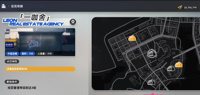 想要开启开店之旅那第一步就需要先找到入口,然后找到游戏内的万事版,直接点击开业大吉,此时就可以进入店铺管理主界面。这一个界面就是店铺运营的核心控制台,右上角还会直接显示当前的管理等级。中间区域就可以清晰的查看结算收益,还有每日收入明细,还会实时提示原材料库存是否充足,方便大家能迅速的掌握店铺经营状态。购买店铺就需要前往指定地点打开游戏地图,然后找到房产中介。