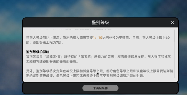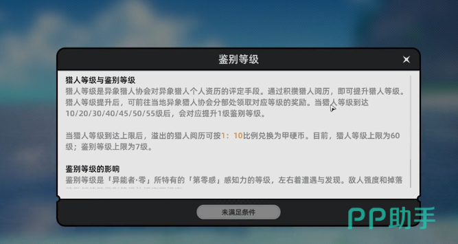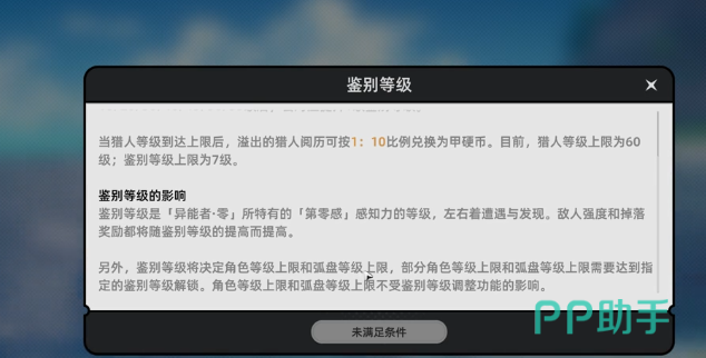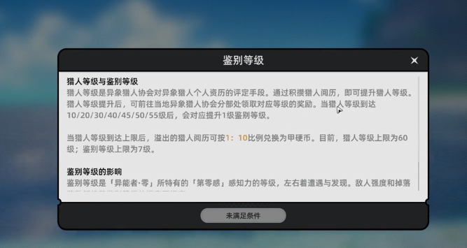 猎人等级就是账号整体等级上限是60级。鉴别的等级是伴随着猎人等级而逐渐的提升,达到10级,12级,13级,14级,15级,55级,65级时都会对应的提升鉴别等级。上限就是7级鉴别的等级,还会直接影响到敌人的强度以及掉落的奖励,同时还会决定角色的等级上限。例如当前你的鉴别等级是一,那么角色最高就只能够升级到40级,想要突破50级,那就需要提升鉴别等级为二。