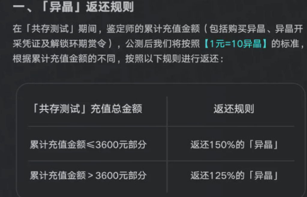 既然说到异晶,他其实也会进行返还,通常情况下是一人民币充值等于10异晶,这种情况是阶梯式的返还力度倒是比较好的,一旦玩家累计充值3600元以内的话,直接按150%返还已经,超过3600元的部分,直接按125%进行返还。这种情况其实并没有所谓的上限,简单来说就是玩家充值5000元的时候,前面3600元直接返还54000异晶,剩下的1400元直接返还17500异晶。