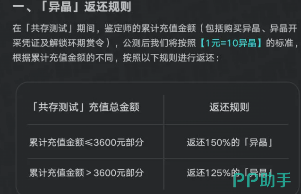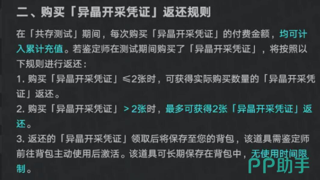 玩家在了解通行证的返还机制的时候,其实就是玩家买通行证的钱会直接算到总充值当中,然后玩家就能够参与异晶返还。其次,大家需要注意的就是通行证的道具单独返还,单账号最多返还两张,玩家不管是在测试的时候买了一张,还是买了5张,在游戏上线的时候只给两张,通常情况下是不会多给,一旦返还之后,通行证就会发放到背包当中,并且是永久有效的,一旦成功激活之后就能够用30天,并且能够领全部的权益。不过在这个时候玩家需要注意,它不会再额外产生异晶,因为所有的钱已经在异晶里返还过了。
