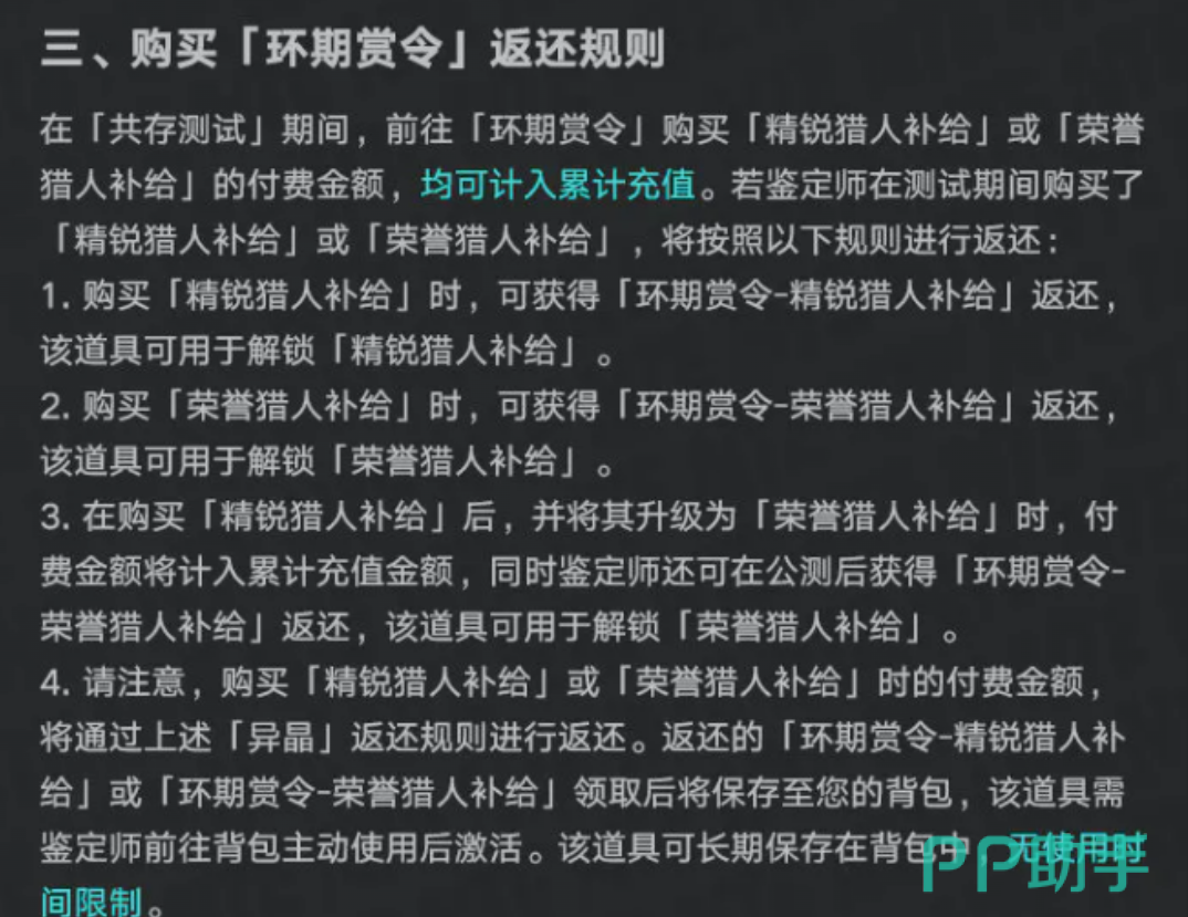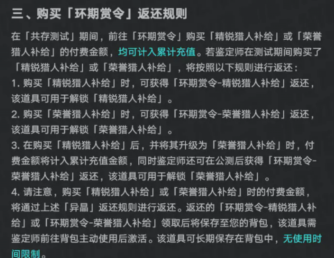 最后再说说环期赏令,这个其实就是战令,返还的规则也特别的简单,那就是玩家在测试的时候,如果购买了精锐的猎人补给。在这样的情况下,公测就按1:1返对应解锁的道具,所以说玩家要是先买的是精锐的猎人,再升级成荣耀,公测的时候就直接返还荣耀版本的道具。这种情况其实并不是拆分返还的,如果说玩家购买的是战令,他的钱同样也是记录到总充值当中,当然也会涉及到异晶的返还。
