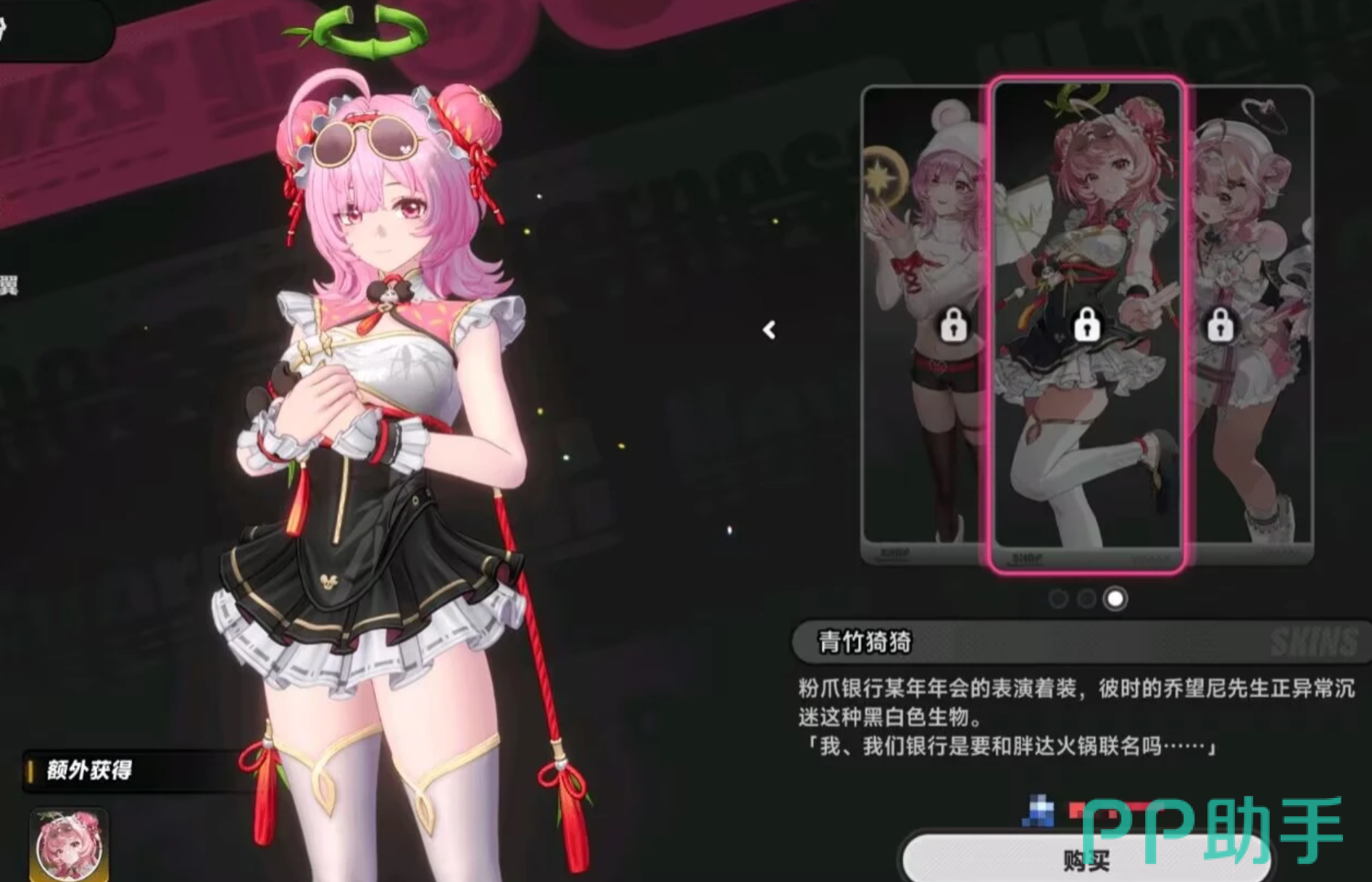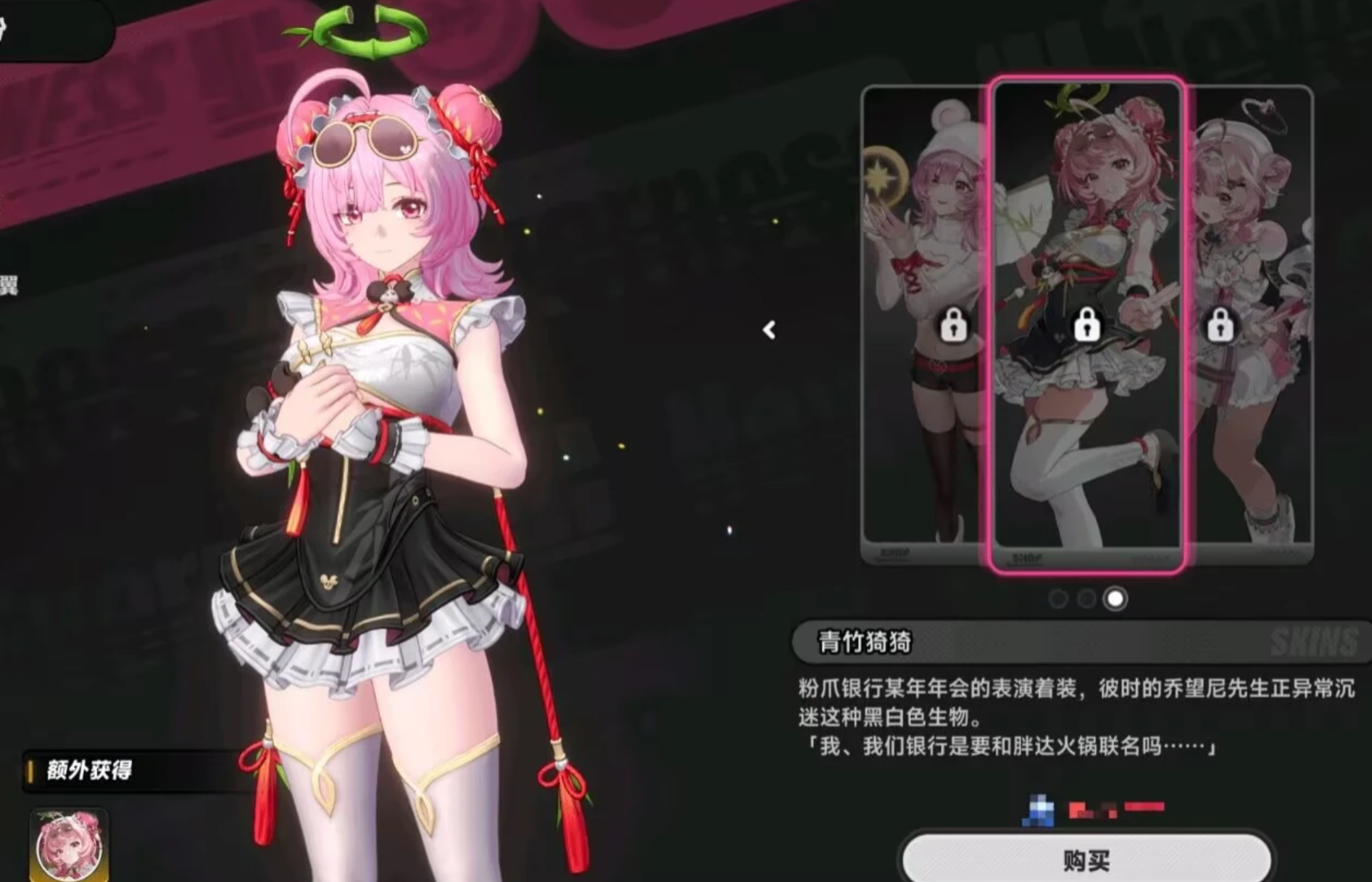 青竹猗猗作为比较火热的外观,它其实还有一段趣味性比较强的背景故事。由于他作为粉爪银行某届年会的表演时装,当时银行的乔望尼先生格外的沉迷。可爱的黑白色圆滚滚的生物,也正是因为这份喜欢,才有了小吱这套特别的年会造型。虽然说官方并没有直白的点名原型,但是众多的玩家在体验游戏的时候,往往一看就能够懂,毕竟这种看上去比较含蓄的设定,往往也能够让时装多了更多的趣味性。