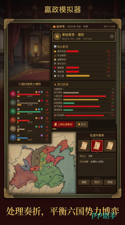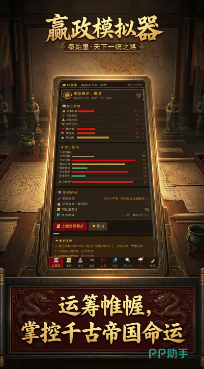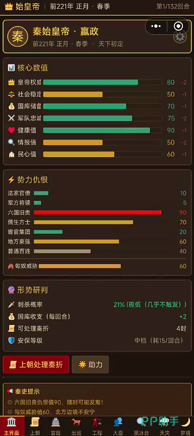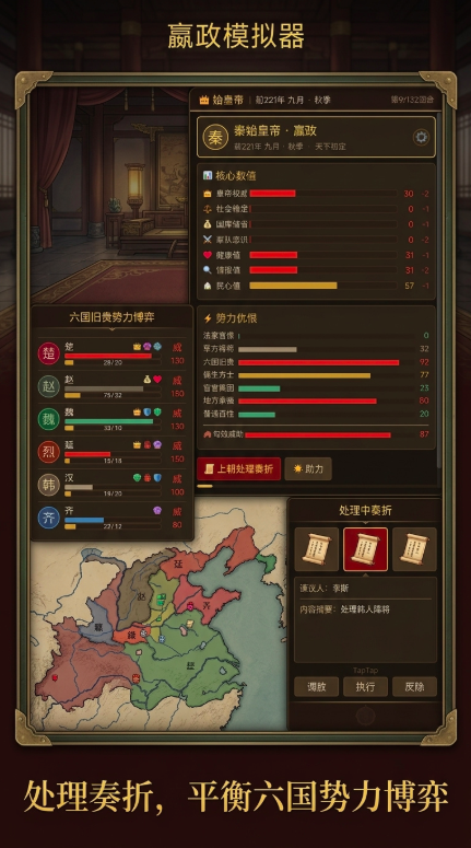 玩家直接穿越回2000年以前化身为秦始皇嬴政,在这里不仅要学会正确的处理奏折,还要对六部政务进行统一管理。玩家可实时了解自身的核心数值,从皇帝权威到社会稳定,再到国库储备等七项核心指数都可以实时查询。