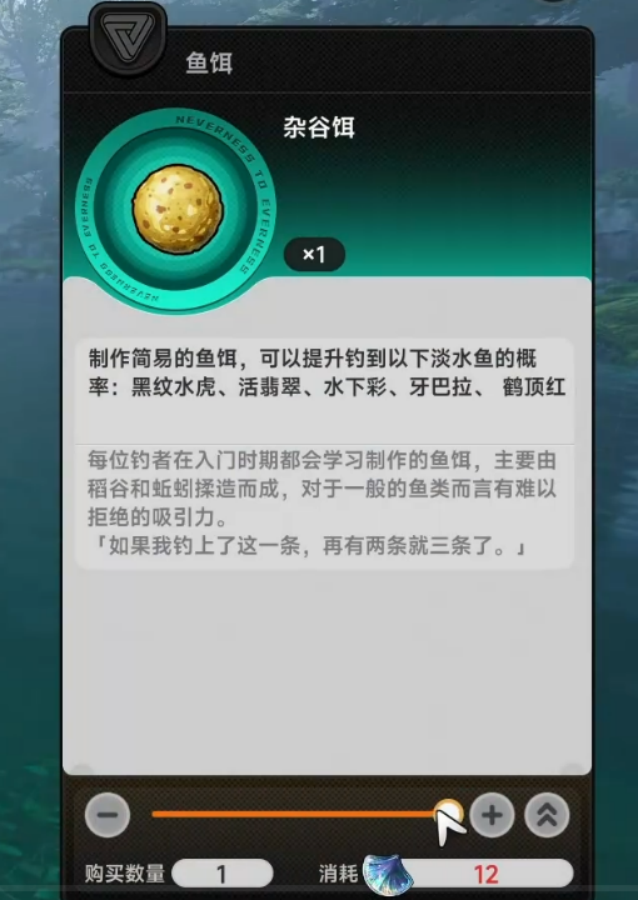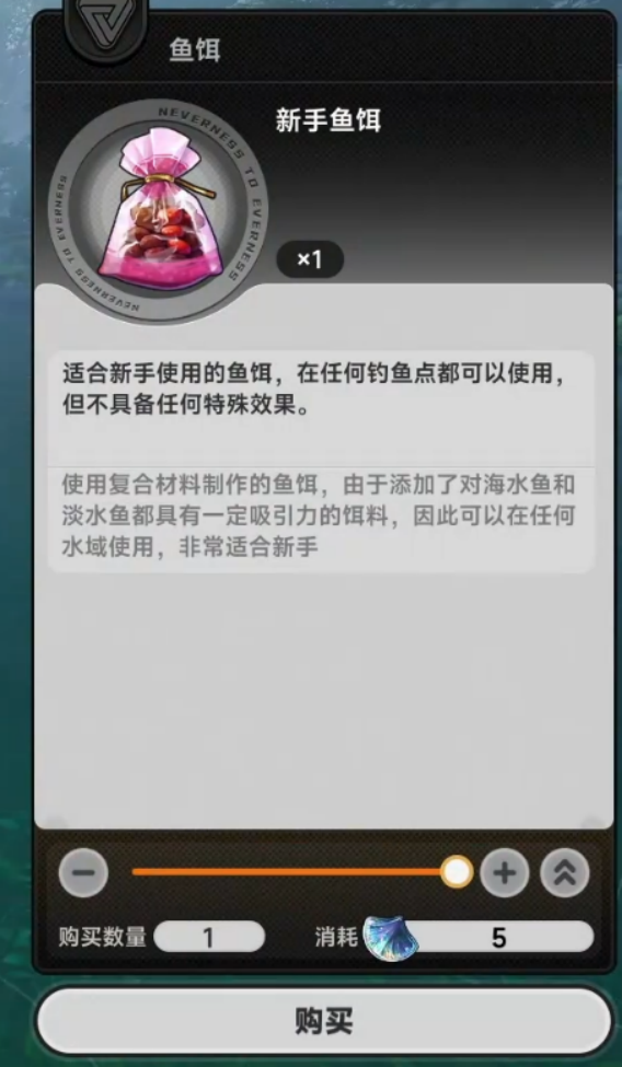 先说说新手鱼饵。这个饵料比较特别的一点,就是通用性很强。淡水钓点能用,海水钓点也能用,基本上走到哪里,都是能使用的。不过有一个点要注意,用这个饵料,不会给你带来任何稀有鱼种的概率加成,就是个普通的万用型饵料,没有什么特别的提升效果。对刚开始接触钓鱼系统的玩家来说,它的好处就是省心,不用去研究每个钓点该带哪种专门的饵料,一种搞定所有情况。但是如果你已经过了入门期,有了比较明确的目标鱼种,这个饵料就有点不够用了,换成针对性更强的饵料,效率会好很多。
