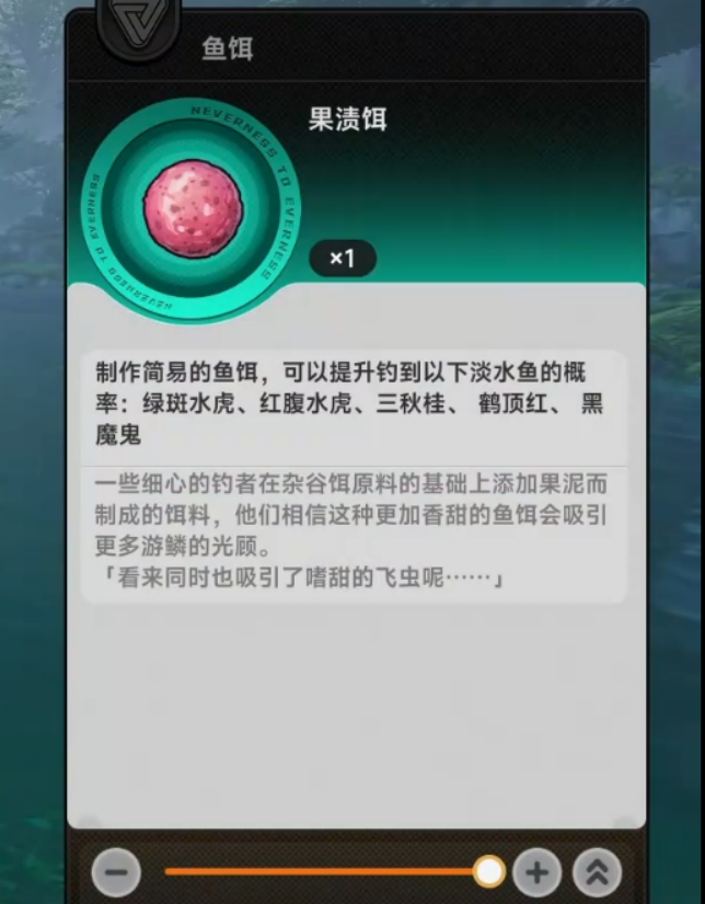 果渍饵的制作思路,跟杂谷饵有点像,但是多加了一样——果泥。加了果泥之后,做出来的饵料气味会偏甜一些,这种气味对另外几种淡水鱼吸引力比较强。用果渍饵,会提升钓到绿斑水虎、红腹水虎、三秋桂、鹤顶红还有黑魔鬼的概率。如果你现在想钓的,正好是果渍饵覆盖的这几种鱼,那比起用新手鱼饵,用果渍饵去钓,效率差距还是挺明显的。
