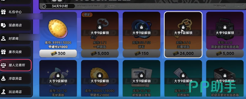 第三种方式为“猎人交易所”,属于中后期核心资源渠道。该功能需将“都市大亨”玩法等级提升至12级方可开启。一旦激活,玩家可通过挂单、竞拍、批量交易等多元模式高效获取大量无梦果核,显著缩短技能成长周期。