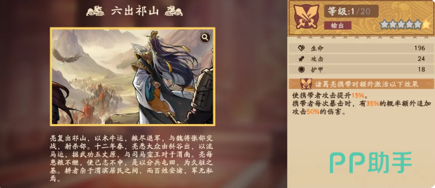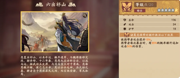 六星之后的他就是在看破能力叠加到8层效果之后,诸葛亮每一次的暴击都会造成伤害,虽然这里是可以叠加到8层,跟初始的4层不一样,但是他只要能够将天赋解锁到到四星的情况下,他的这个上限层数就会变成八层了,所以只有在四星之后,大家可以看到他的层数叠加上限才会在达到八层,这里每次造成的暴击伤害当中都有35%的概率可以造成追加伤害,这里追加的数值也比较高,有150%的效果,所以放在游戏当中,诸葛亮他并不算一个输出比较弱的武将,另外他通过自身的普攻也可以追加给敌人部分的攻击伤害,他这里普攻叫做八阵,在攻击敌方的时候,只能针对敌人的单体角色进行攻击,而且这里他可以根据目前敌人所站格子,造成一个远程伤害,他的攻击能力当中虽然是百分百的伤害,但是因为没有额外输出效果,所以建议大家还是跟天赋或者是必杀技联合在一起使用。