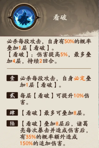 诸葛亮自身的天赋效果当中可以给他带来一些额外的加伤能力,而且在游戏当中,他也绝对是一个达到后期会越来越强的英雄,自身的能力叫做看破这个天赋可以让他在每一段的必杀大招攻击当中,给自己带来50%概率触发看破,看破这个状态在有一层的情况下,就可以让他在伤害数值上面增加5%的效果,而且他的这个看破最多是可以快速叠加到四层,此时带来的一个伤害百分比提升就比较高了,另外他后期通过这里的天赋提升每一段攻击效果,基本都是必定会再加一层看破的,所以这里4层的效果可以很快的叠加起来,而在这个天赋效果升星到6星之后,天赋能力也会得到足够多的提升。